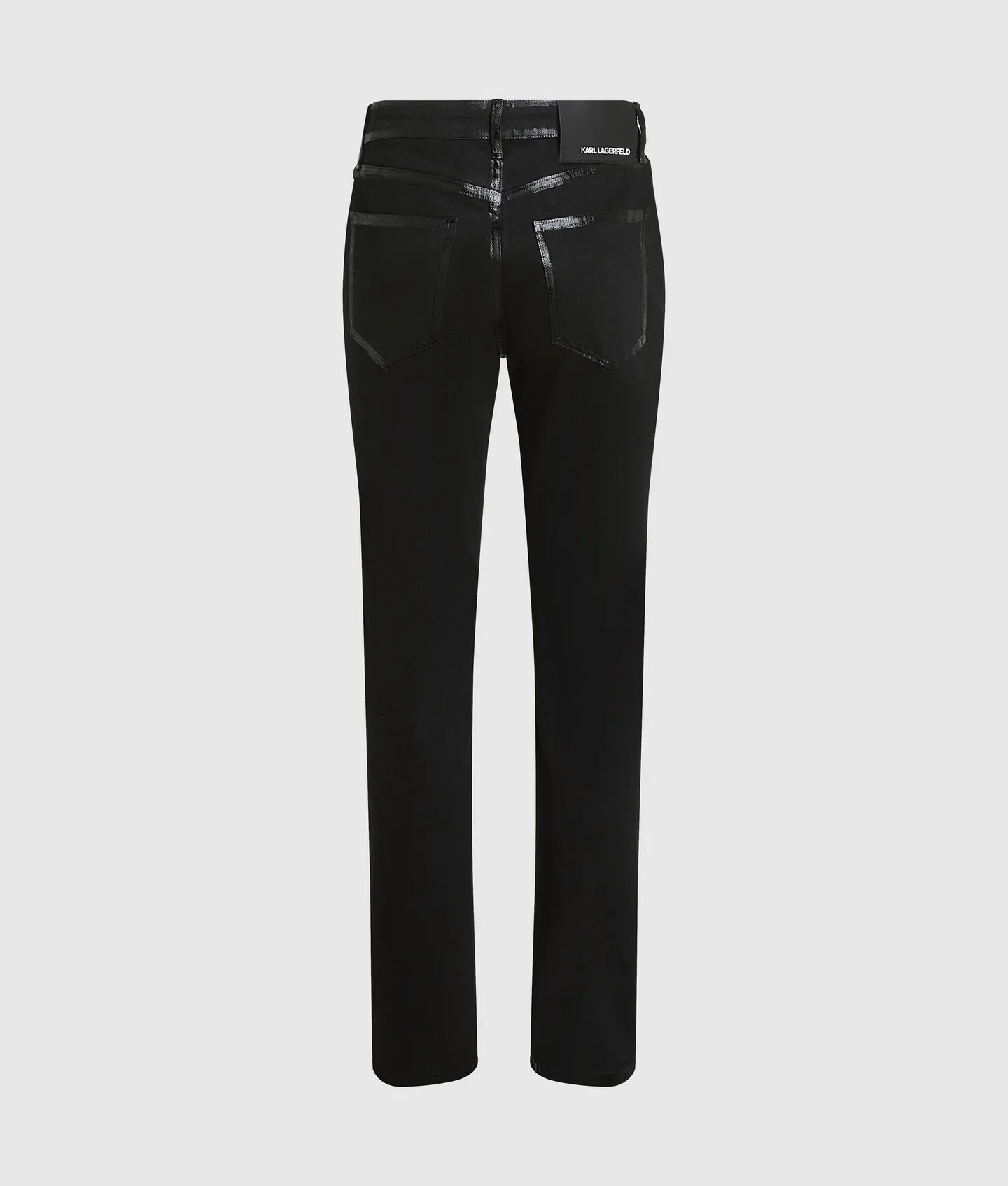 These slim jeans feature a sleek metallic coating along the seams, adding a bold touch to a classic five-pocket design. The KARL LAGERFELD patch at the waistband completes the look with signature style.