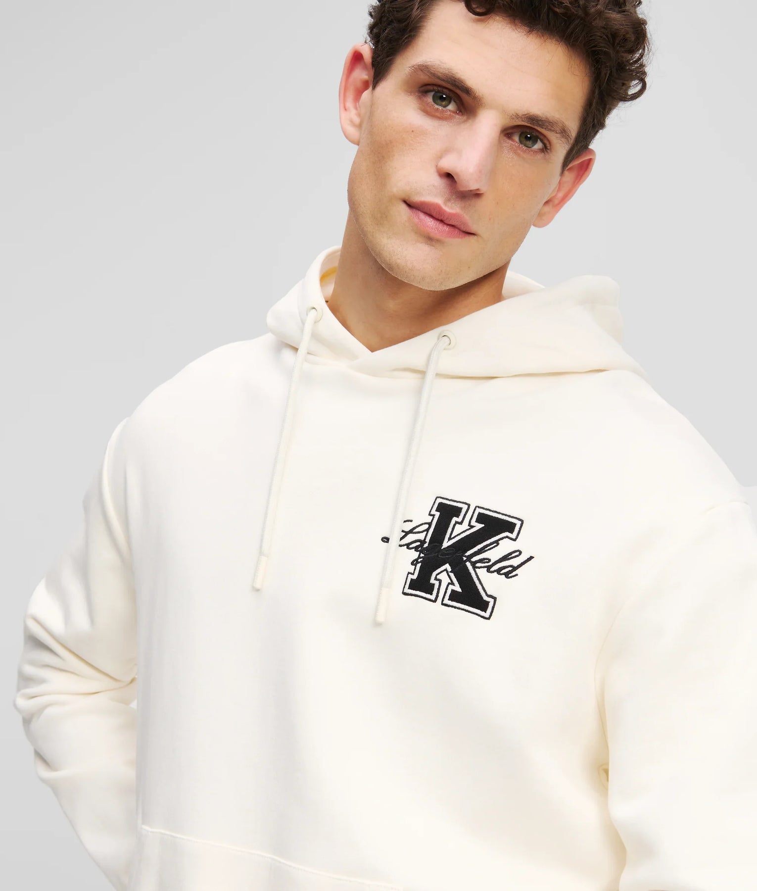 A casual loose fit defines this drawcord hoodie, featuring a practical kangaroo pocket and ribbing at the cuffs and hem for enhanced comfort. The bold K-initial artwork at the chest makes a striking statement.