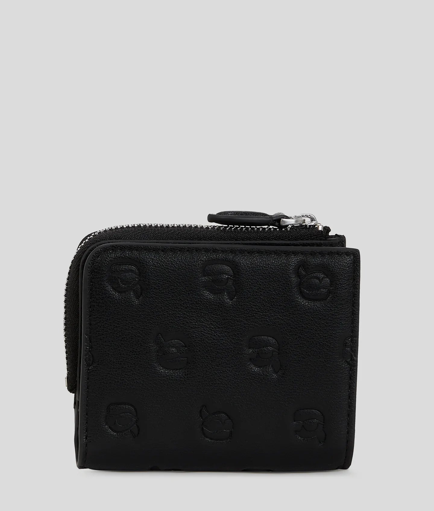 This petite yet practical wallet showcases a bifold design with a secure button closure. A zipped compartment and multiple card slots offer effortless organization, while an embossed Ikon monogram design adds a distinctive flair. A subtle KARL LAGERFELD logo completes the chic accessory.