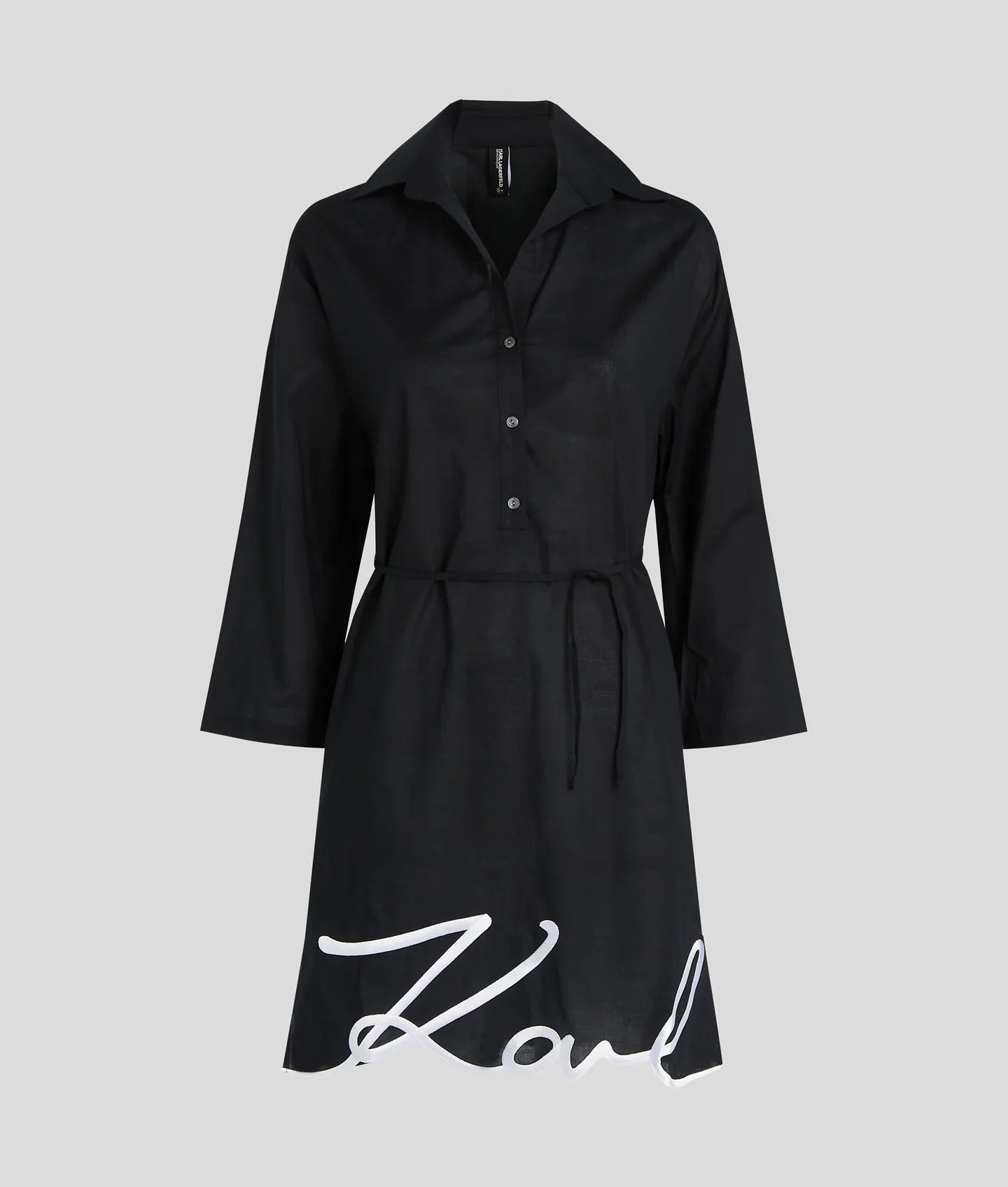 Travel to and from the beach in elegant style with this classic shirt dress. The feminine silhouette features a waist-cinching belt, side slits, and a KARL Signature embroidered hem.