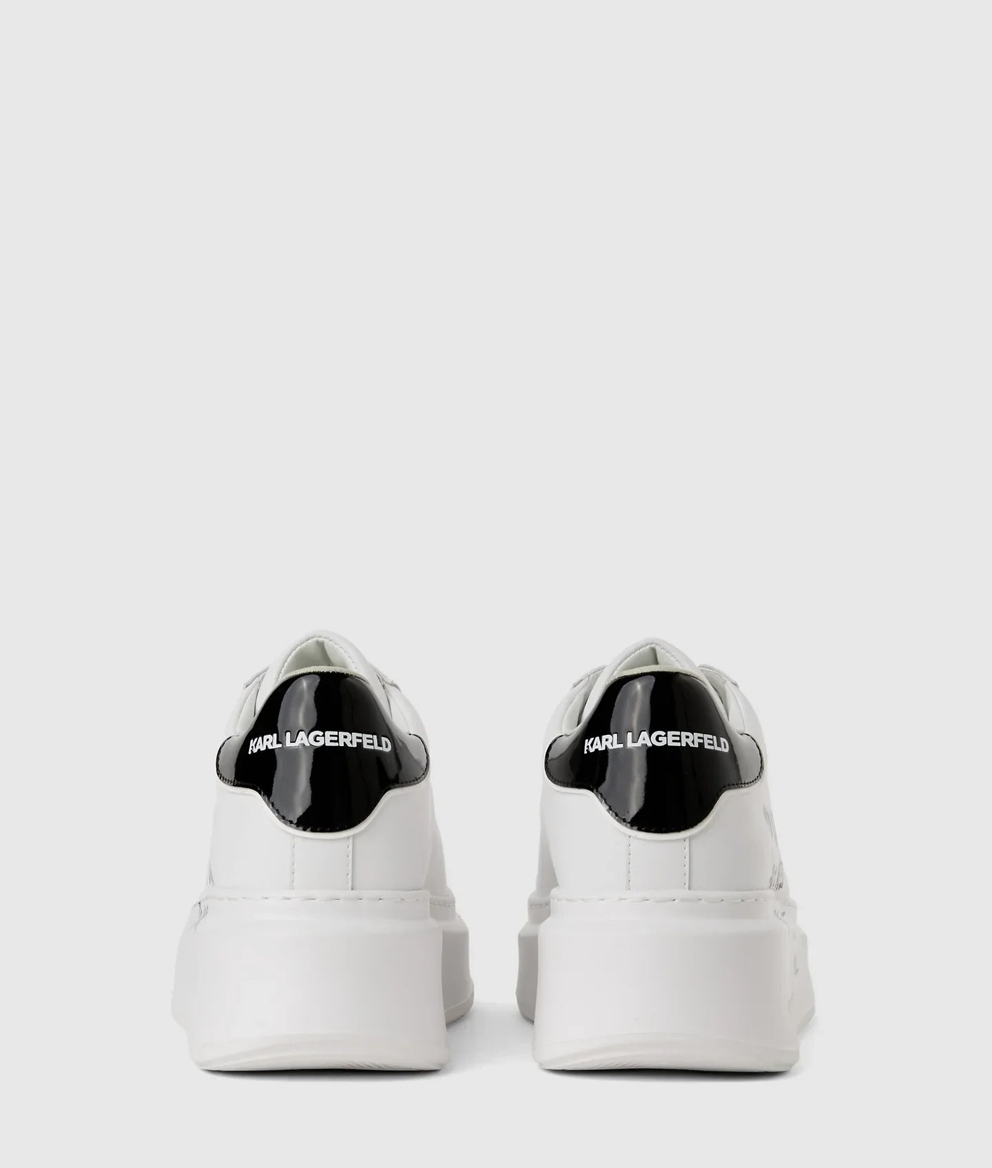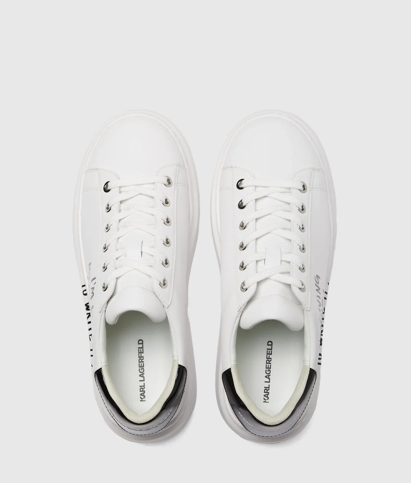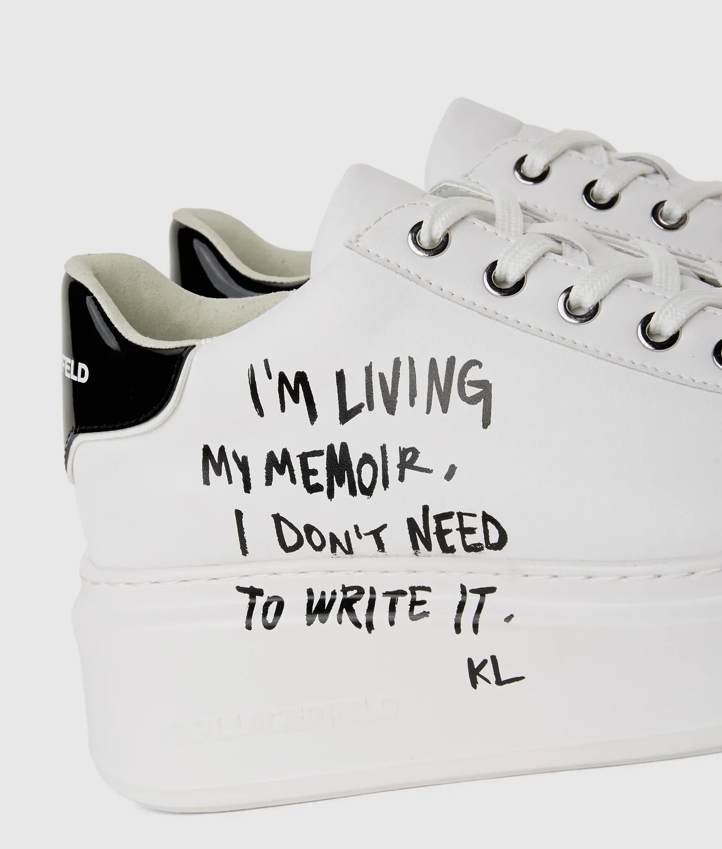 Add a touch of rebellious spirit to your wardrobe with these bold sneakers, featuring an inspirational quote from Karl Lagerfeld. A high wedge sole and patent leather heel counter complete the confident look.