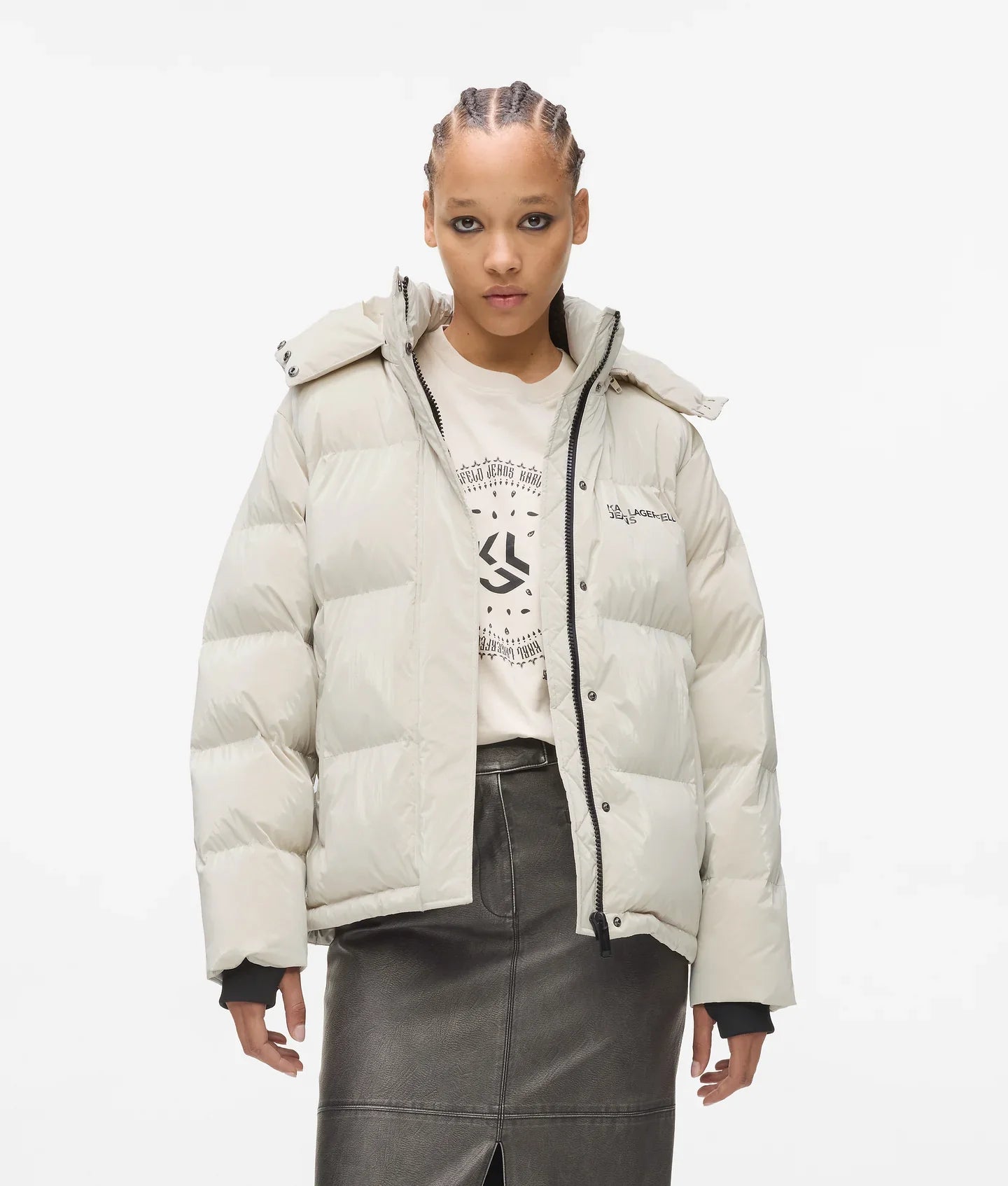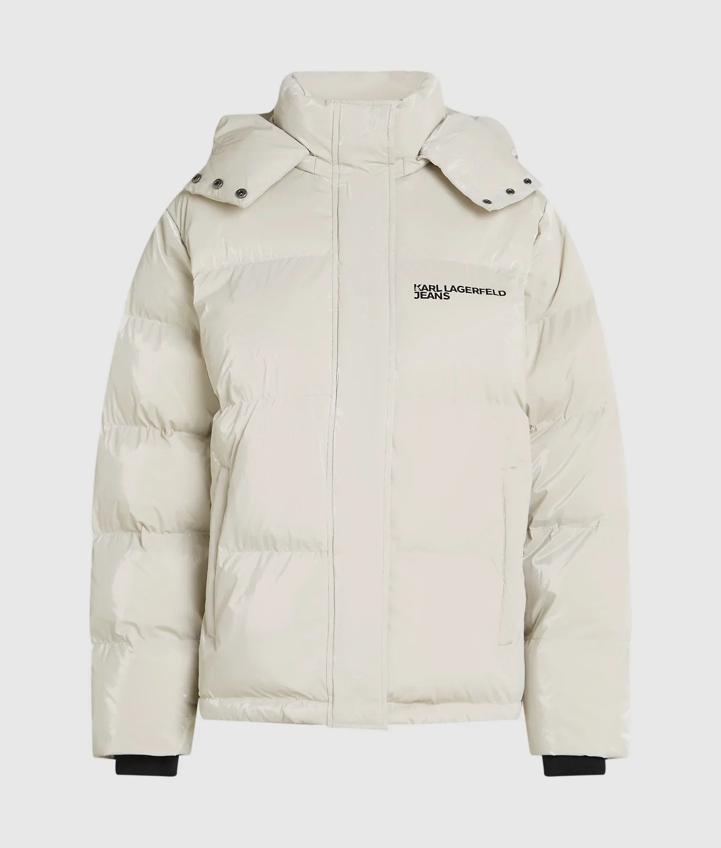 Brave the cold in style with this high-shine puffer jacket. Padded for warmth, the eye-catching design features a detachable hood for all-weather wear.
