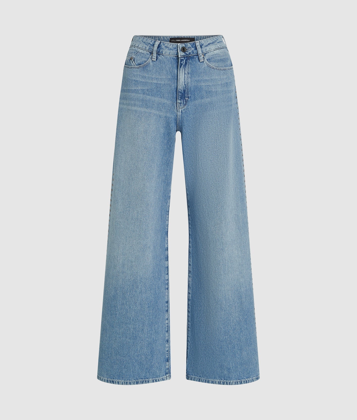 These high-rise, wide jeans offer a flattering, leg-lengthening fit. Gunmetal studs trace the outer seams and pockets, adding a bold, refined finish.